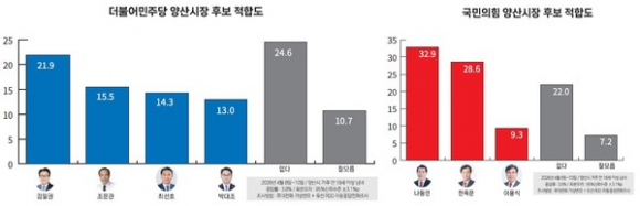 더불어민주당과 국민의힘이 6·3 지방선거 양산시장 후보 선출을 위한 경선에 속도를 내고 있는 가운데, 양당 예비후보 적합도 조사에서는 민주당 김일권 예비후보와 국민의힘 나동연 예비후보가 각각 선두를 기록한 것으로 나타났다. 당별 최종 후보를 가리는 경선이 본격화한 상황에서 이번 결과는 각 당의 후보 경쟁 구도와 남은 경선 전략을 가늠할 참고지표가 될 것으로 보인다.양산신문은 한국여론평판연구소(KOPRA)에 의뢰해 지난 8일부터 10일까지 3일간 양산시 거주 만 18세 이상 남녀 1,001명을 대상으로 유·무선 자동응답(ARS) 방식의 여론조사를 실시했다.우선 더불어민주당 양산시장 후보 적합도 조사에서는 김일권 예비후보가 21.9%로 가장 높았다. 이어 조문관 예비후보 15.5%, 최선호 예비후보 14.3%, 박대조 예비후보 13.0% 순으로 나타났다. 없다 24.6%, 잘 모름 10.7%로, 지지후보를 정하지 않은 응답이 35.3%에 달해 여전히 부동층 규모가 적지 않은 것으로 분석된다.1위 김일권 예비후보와 2위 조문관 예비후보 간 격차는 6.4%p로, 오차범위 밖에서 김 예비후보가 앞섰다. 연령별로는 김일권 예비후보가 30대(24.9%)·40대(28.7%)·50대(22.3%)·60대(22.4%)·70세 이상(19.5%)에서 모두 앞섰다. 반면, 18~29세는 최선호(21.1%) 예비후보가 가장 높은 지지를 받았고, 박대조(18.2%)·조문관(13.2%)·김일권(9.3%) 순으로 나왔다. 지역별로는 물금·원동·강서·상북·하북·중앙·삼성지역인 양산갑지역구에서 김일권 23.4%, 조문관 17.5%, 동면·양주·서창·소주·평산·덕계지역인 양산을지역구에서 김일권 20.5%, 조문관 13.5%로 김 예비후보가 모두 우세했다. 성별 역시 남성은 김일권 22.0%, 조문관 17.4%, 여성은 김일권 21.8%, 조문관 13.6%로 김 예비후보가 앞섰다.국민의힘 양산시장 후보 적합도 조사에서는 나동연 예비후보가 32.9%로 가장 높았다. 한옥문 예비후보가 28.6%로 뒤를 이었고, 이용식 예비후보는 9.3%를 기록했다. 없다 22.0%, 잘 모름 7.2%로, 국민의힘 역시 부동층이 29.2%에 달했다.1위 나동연 예비후보와 2위 한옥문 예비후보 간 격차는 4.3%p로 오차범위 내 접전이다. 연령별로는 나동연 예비후보가 18~29세(38.3%)·30대(32.1%)·40대(31.5%)·70세 이상(40.6%)에서 앞섰고, 한옥문 예비후보는 50대(33.6%)·60대(33.2%)에서 우위를 보였다. 지역별로는 양산갑지역구에서 나동연 34.1%, 한옥문 26.2%로 나 예비후보가 앞섰지만, 양산을지역구에서는 나동연 31.7%, 한옥문 30.9%로 사실상 접전 양상을 보였다. 성별로는 남성에서 나동연 31.8%, 한옥문 32.7%로 한 예비후보가 근소하게 앞섰고, 여성에서는 나동연 34.0%, 한옥문 24.4%로 나 예비후보가 우세했다.민주당은 1위와 2위 간 격차가 오차범위 밖으로 벌어지며 김일권 예비후보가 선두를 형성한 반면, 국민의힘은 나동연·한옥문 예비후보가 오차범위 내 접전을 이어가는 구도다. 다만 양당 모두 없다·잘 모름 응답이 30% 안팎에 이르고 있어, 최종 후보 확정 전까지 판세는 여전히 유동적인 것으로 풀이된다.한편, 이 조사는 양산신문이 한국여론평판연구소(KOPRA)에 의뢰해 2026년 4월 8일~4월 10일 경상남도 양산시 만 18세 이상 남녀 1,001명을 대상으로 무선 가상번호(73%)와 유선 RDD(27%)를 이용한 ARS조사 방식으로 진행했다. 응답률은 3.8%(2만6,616명 중 1,001명)이며 2026년 3월 말 행정안전부 주민등록인구 기준으로 성별, 연령대별, 지역별 가중값을 부여했고, 표본오차는 95% 신뢰수준에 ±3.1%p다. 자세한 조사 결과는 중앙선거여론조사심의위원회 홈페이지에서 확인할 수 있다. 6.3지방선거 특별취재팀
