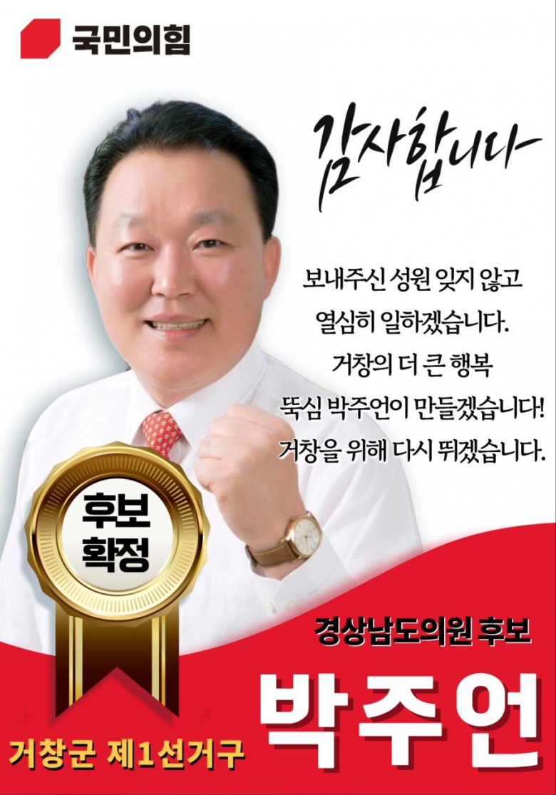 국민의힘 경남도당공천관리위원회(위원장 강민국)는 15일 거창지역 도의원후보로 제1선거구에 박주언후보, 제2선거구에 공재권 후보를 각각 공천했다.존경하는 국민의힘 당원 동지 여러분!거창군 제1선거구 경상남도 도의원 후보 박주언입니다.압도적인 성원과 믿음으로 저를 경남도의원 후보로 확정해주셔서 진심으로 머리 숙여 감사드립니다.당원 여러분께서 보내주신 소중한 한 표 한 표에 담긴 거창 발전의 염원, 결코 잊지 않겠습니다.저 박주언, 오직 거창의 더 큰 행복을 위해 뚝심 있게 나아가겠습니다.감사합니다!뚝심 박주언 올림