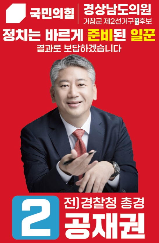 국민의힘 경남도당공천관리위원회( 위원장 강민국)은 15일 거창지역 도의원 후보로 제1선거구에 박주언 후보 제2선거구에 공재권 후보를 각각 공천했다. 당원 여러분의 선택! 공재권 입니다.존경하는 당원 여러분!당원 한 분 한 분의 선택이얼마나 무거운 책임인지잘 알고 있습니다.그 뜻을 가슴 깊이 새기고,반드시 약속을 이행하겠습니다.초심을 잃지 않고, 당원의 목소리가정책이 되는 정치를 실천하겠습니다.끝까지 책임지는 모습으로보답하겠습니다.감사합니다.경상남도의원 거창군 제2선거구국민의힘 후보 공 재 권 올림